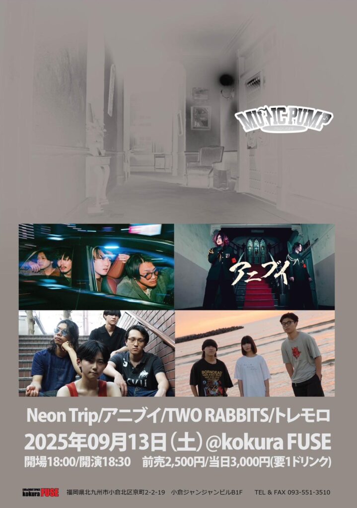 <CAST>Neon TripTWO RABBITSトレモロアニブイ OPEN:18:00START:18:30前売り/取り置き:¥2500/当日3000円(要1D) kokura FUSE福岡県北九州市小倉北区京町2-2-19 小倉ジャンジャンビルB1Fhttp://sv54.wadax.ne.jp/~east-w-co-jp/fuse/